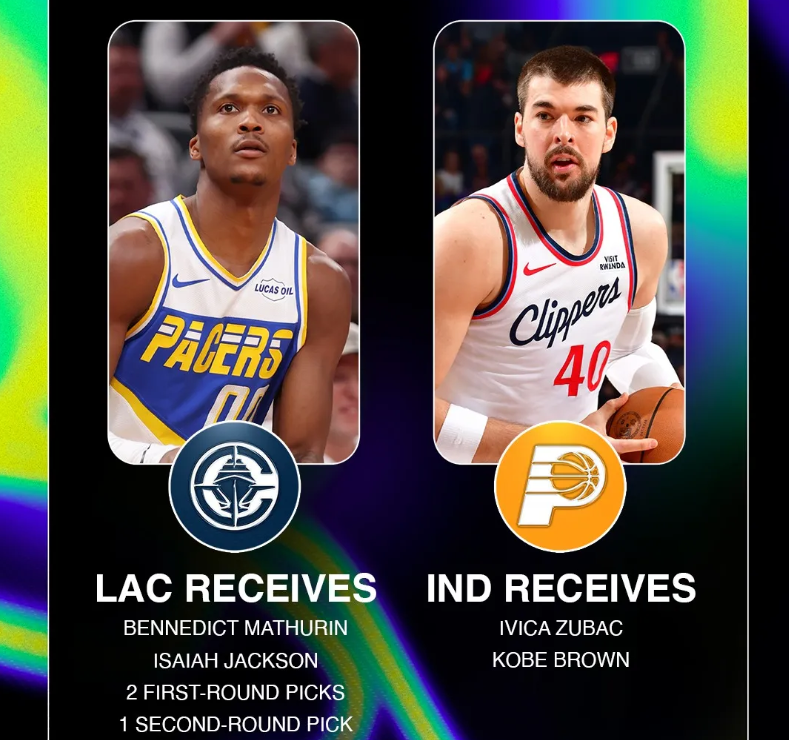 马瑟林、以赛亚·杰克逊,附加29年步行者无保护首轮、26年步行者首轮(前4顺位、10-30顺位保护,如果没有兑现,则变成31年无保护首轮)、28年独行侠次轮